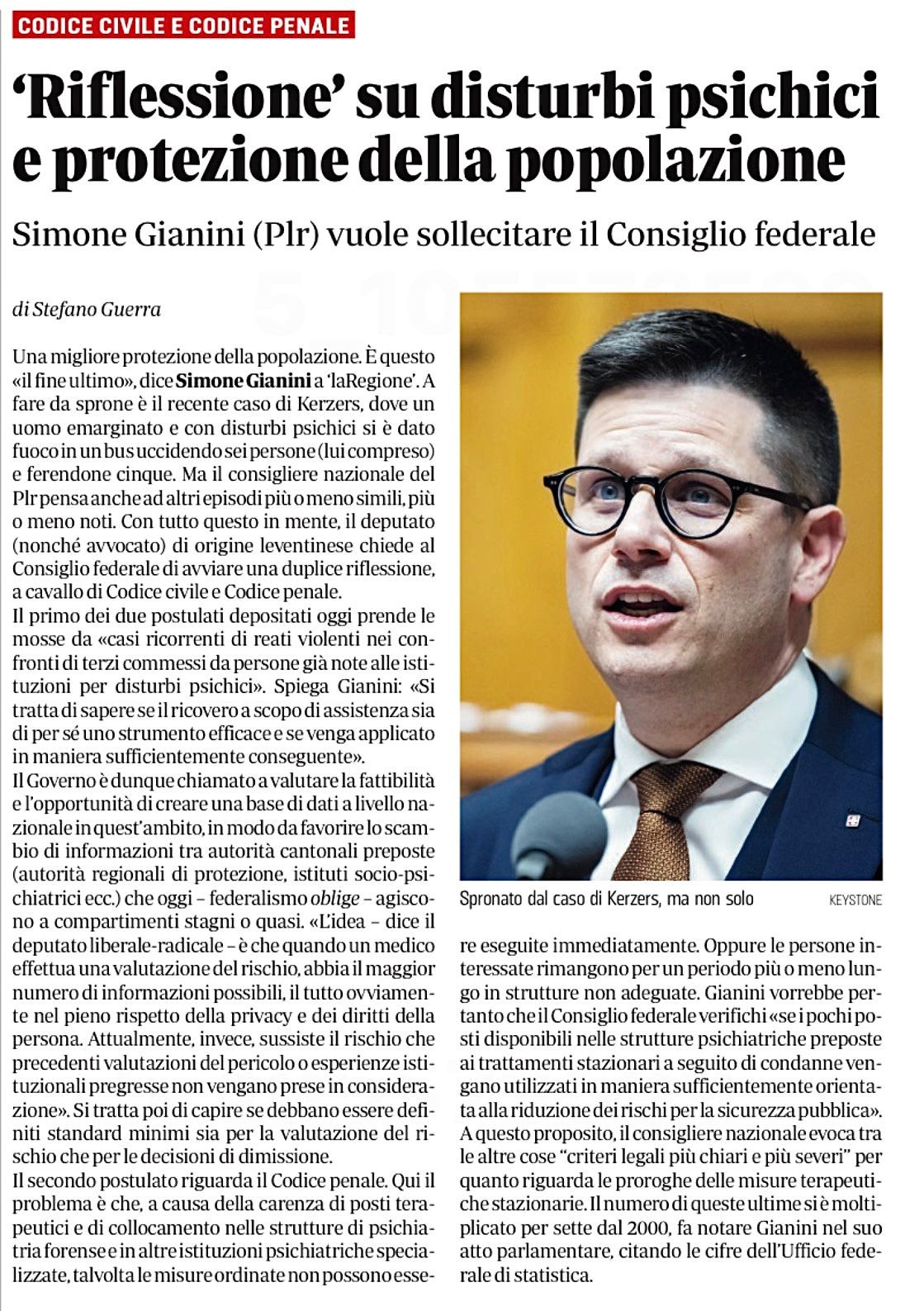 ‘Una riflessione’ su disturbi psichici e protezione della popolazione Dopo i fatti di Kerzers, con due postulati il consigliere nazionale Simone Gianini (Plr) intende sollecitare il Consiglio federale… Leggi l'articolo (IT)